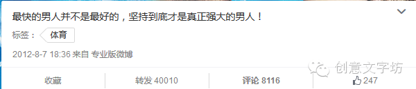 2、2012年奥运会,刘翔旧伤复发,跨栏摔倒,但坚持走完全程。杜蕾斯对此发出如下微博:最快的男人并不是最好的,坚持到底才是真正强大的男人!